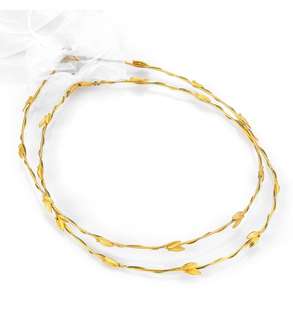 Χειροποίητα στέφανα γάμου από καθαρό ασήμι 925. Έχουν περάσει από ειδική επεξεργασία για να μην χάνουν τη λάμψη τους στον χρόνο. Αποτελούνται από μία ασημένια-επιχρυσωμένη ματ βέργα στην οποία περιπλέκεται μια δεύτερη με φύλλα και καρπούς ελιάς. Συνοδεύονται από δύο καρφίτσες για το πέτο του γαμπρού και του κουμπάρου. Παραδίδονται σε πολυτελές κουτί με σατέν επένδυση και πιστοποιητικό γνησιότητας.